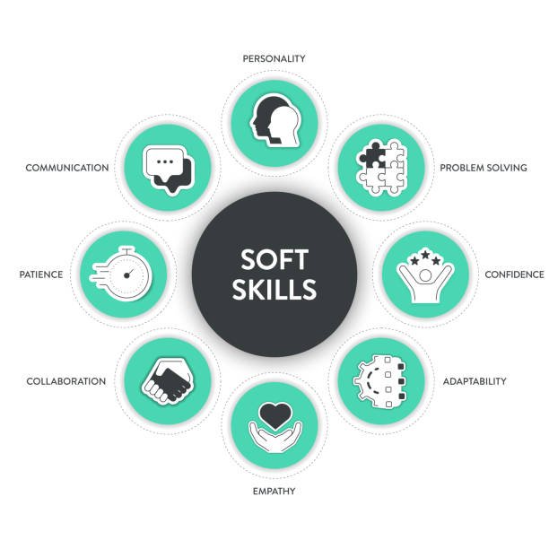 Soft Skills model strategy framework infographic diagram banner with icons has personality, problem solving, confidence, adaptability, empathy, collaboration, patience and communication. Presentation.